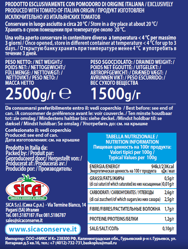 Томаты Sica очищенные в томатном соке, 2.5кг