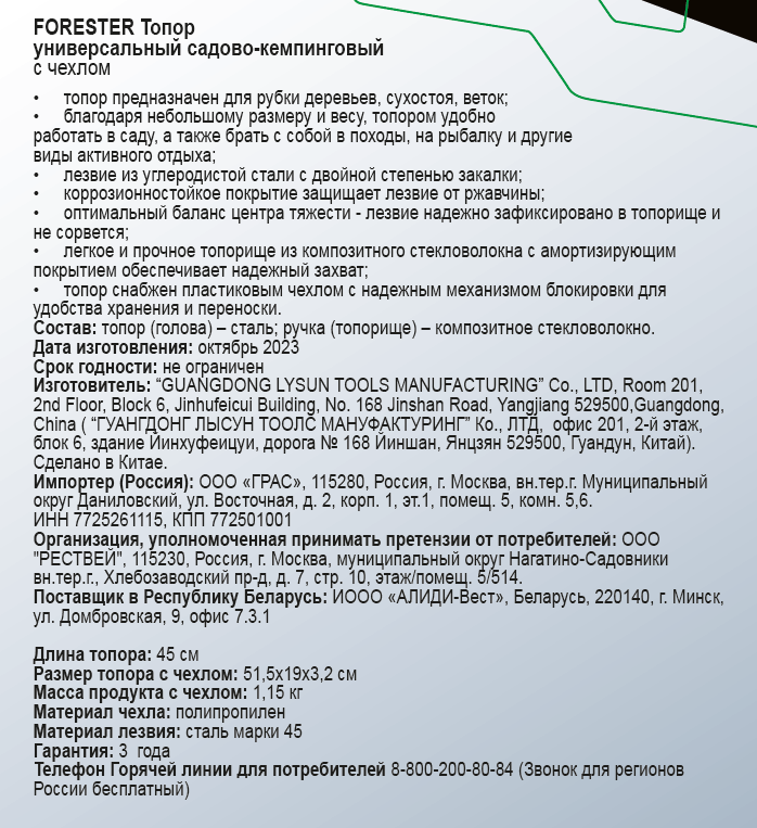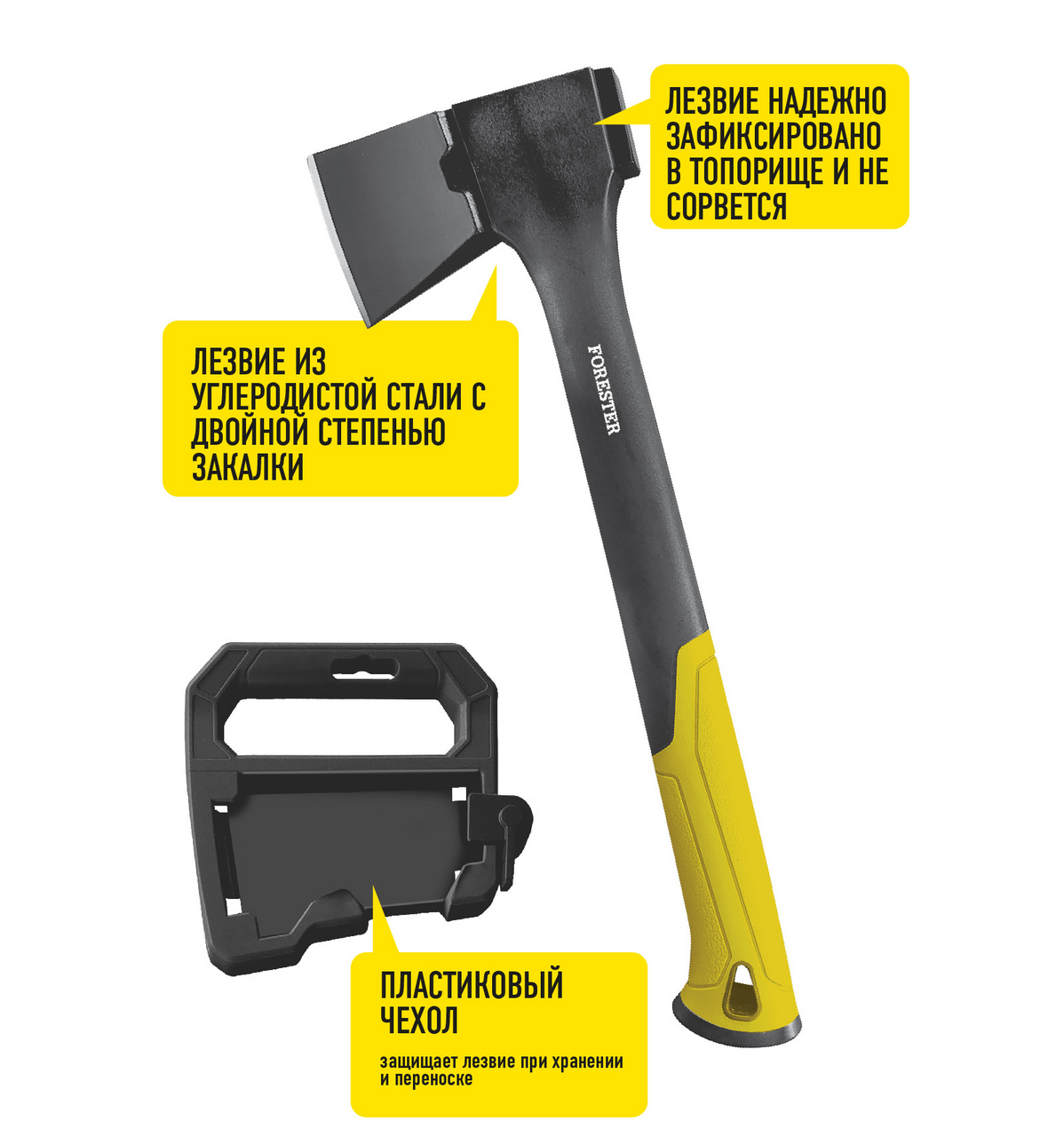 Топор предназначен для рубки деревьев, сухостоя, веток. Благодаря небольшому размеру и весу, топором удобно работать в саду, а также брать с собой в походы, на рыбалку и другие виды активного отдыха. Лезвие из углеродистой стали с двойной степенью закалки. Коррозионностойкое покрытие защищает лезвие от ржавчины. Оптимальный баланс центра тяжести - лезвие надежно зафиксировано в топорище и не сорвется. Легкое и прочное топорище из композитного стекловолокна с амортизирующим покрытием обеспечивает надежный захват. Топор снабжен пластиковым чехлом с надежным механизмом блокировки для удобства хранения и переноски.