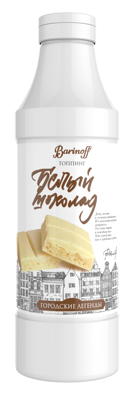 Топпинг Баринофф Белый шоколад, 1кг украсит любой десерт и придаст готовому блюду вкус белого шоколада. Его также можно добавлять в мороженое, поливать им сверху торты, пирожные. Это прекрасная добавка для молочных коктейлей. Она сделает напитки необыкновенными и яркими. Топпинг можно добавить малышам в кашу, и дети точно оценят по достоинству ее. Продукт заключен в красочную яркую бутылку. Герметичная многоразовая упаковка позволяет сохранить вкус и аромат продукции длительное время.