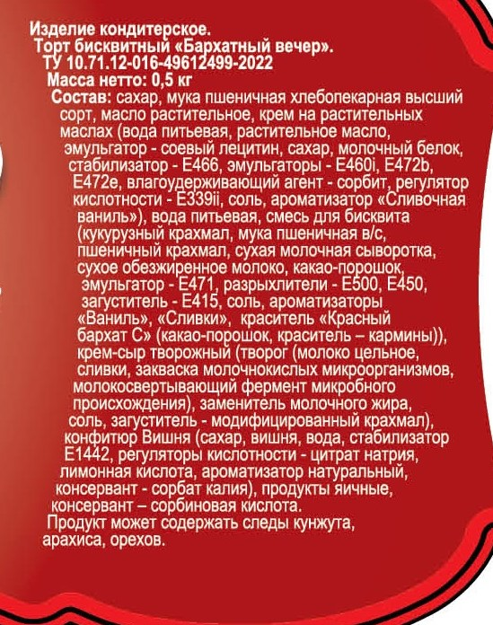 Сахар, мука пшеничная хлебопекарная высший сорт, масло растительное, крем на растительных маслах вода питьевая, растительное масло, эмульгатор - соевый лецитин Е322, сахар, молочный белок, стабилизатор - карбоксиметилцеллюлоза Е466, эмульгаторы - целлюлоза Е460i, эфиры глицерина и молочной и жирных кислот Е472b, эфиры глицерина и диацетилвинной и жирных кислот Е472е, влагоудерживающий агент - сорбит Е420, регулятор кислотности - фосфаты натрия Е339ii, соль, ароматизатор Сливочная ваниль, вода питьевая, Смесь для бисквита кукурузный крахмал, мука пшеничная в/c, пшеничный крахмал, сухая молочная сыворотка, сухое обезжиренное молоко, какао-порошок, эмульгатор - моно- и диглицериды жирных кислот Е471, разрыхлители - карбонаты натрия Е500, пирофосфаты Е450, загуститель - ксантановая камедь Е415, соль, ароматизаторы Ваниль, Сливки, краситель Красный бархат С какао-порошок, краситель – кармины Е120, крем-сыр творожный творог молоко цельное, сливки, закваска молочнокислых микроорганизмов, молокосвертывающий фермент микробного происхождения, заменитель молочного жира, соль, загуститель - модифицированный крахмал, конфитюр Вишня сахар, вишня, вода, стабилизатор - дикрахмалфосфат оксипропилированный Е1442, регуляторы кислотности - цитрат натрия Е331iii, лимонная кислота Е330, ароматизатор натуральный, консервант - сорбат калия Е202, продукты яичные, консервант – сорбиновая кислота Е200.