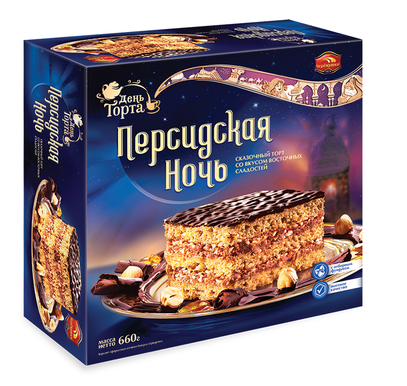 Торт Персидская ночь День торта - торт на основе рассыпчатых песочных коржей, с изысканной начинкой из пралине и дробленого фундука, покрытый глазурью со вкусом горького шоколада. Торт Персидская ночь от Черемушек уже много лет радует покупателей ярким и оригинальным вкусом.