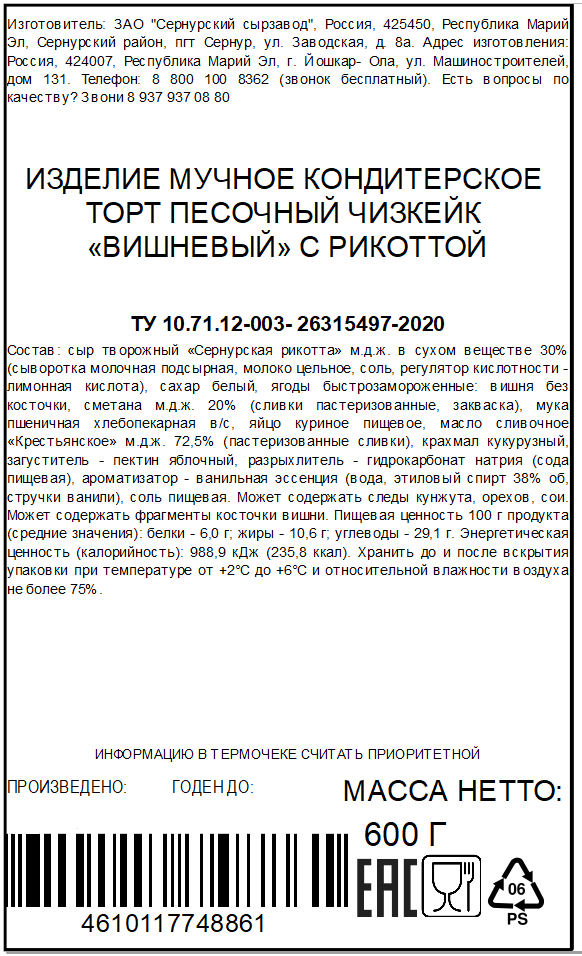 Торт песочный Сернур Чизкейк вишневый с рикоттой, 600г