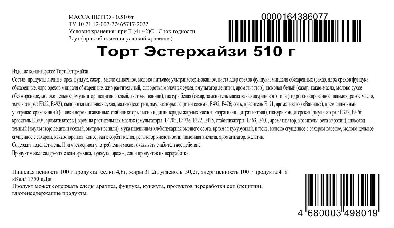 Продукты яичные, орех фундук, сахар, масло сливочное, молоко питьевое ультрапастеризованное, паста ядер орехов фундука, миндаля обжаренных сахар, ядра орехов фундука обжаренные, ядра орехов миндаля обжаренные, жир растительный, сыворотка молочная сухая, эмульгатор лецитин, ароматизатор, шоколад белый сахар, какао-масло, молоко сухое обезжиренное, молоко цельное, эмульгатор: лецитин соевый, экстракт ванили, глазурь белая сахар, заменитель масла какао лауринового типа гидрогенизированное пальмоядровое масло, эмульгаторы: Е322, Е492, сыворотка молочная сухая, мальтодекстрин, эмульгаторы: лецитин соевый, Е492, Е476; соль, краситель Е171, ароматизатор Ваниль, крем сливочный ультрапастеризованный сливки нормализованные, стабилизаторы: моно и диглицериды жирных кислот, каррагинан, цитрат натрия, глазурь кондитерская эмульгаторы: Е322, Е476; краситель Е160а, ароматизаторы, крем на растительных маслах эмульгаторы: Е420ii, Е472е, Е322, Е435, стабилизаторы: Е463, Е401, ароматизатор, краситель: бета-каротин, шоколад тёмный эмульгатор: лецитин соевый, экстракт ванили, мука пшеничная хлебопекарная высшего сорта, крахмал кукурузный, патока, молоко сгущённое с сахаром варёное, молоко цельное сгущённое с сахаром, какао-порошок, консервант: сорбат калия, регулятор кислотности: лимонная кислота, ароматизатор, желатин.