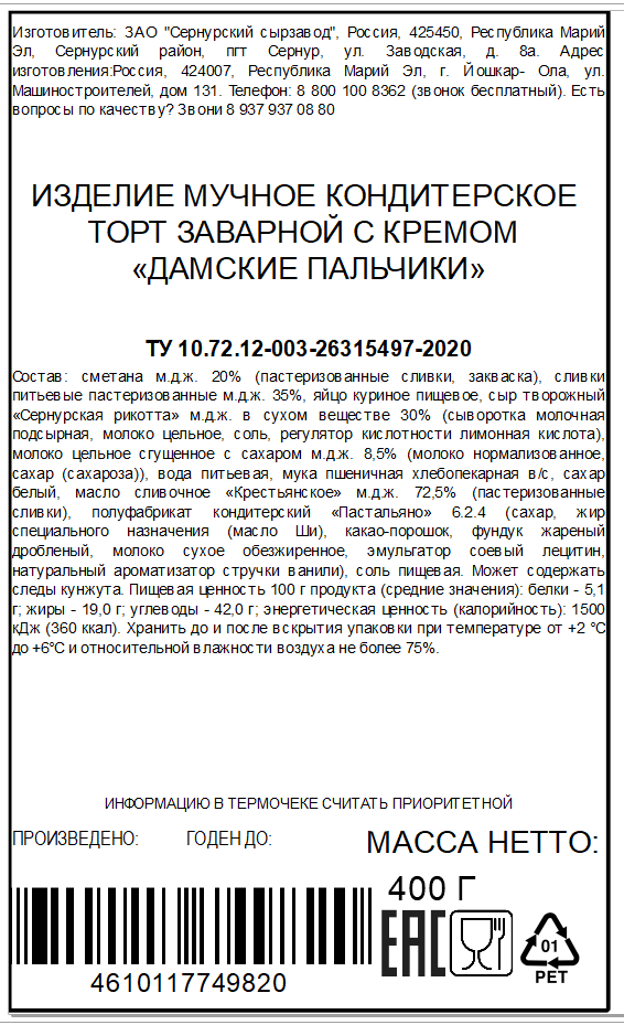 Торт Сернур Дамские пальчики, 400г нежный десерт со сливочным вкусом, покрытый шоколадными шариками. Идеальная гармония формы и содержания. Изящное название ко многому обязывает, и десерт именно такой: утонченно-нежный, возвышенно-романтичный. Десерт, который придется по вкусу и детям, и взрослым. Продукт состоит из пальчиков из заварного теста, крема на основе сернурской рикотты и шоколада.