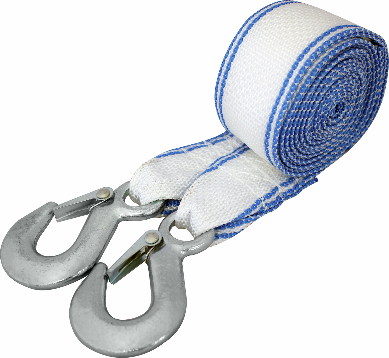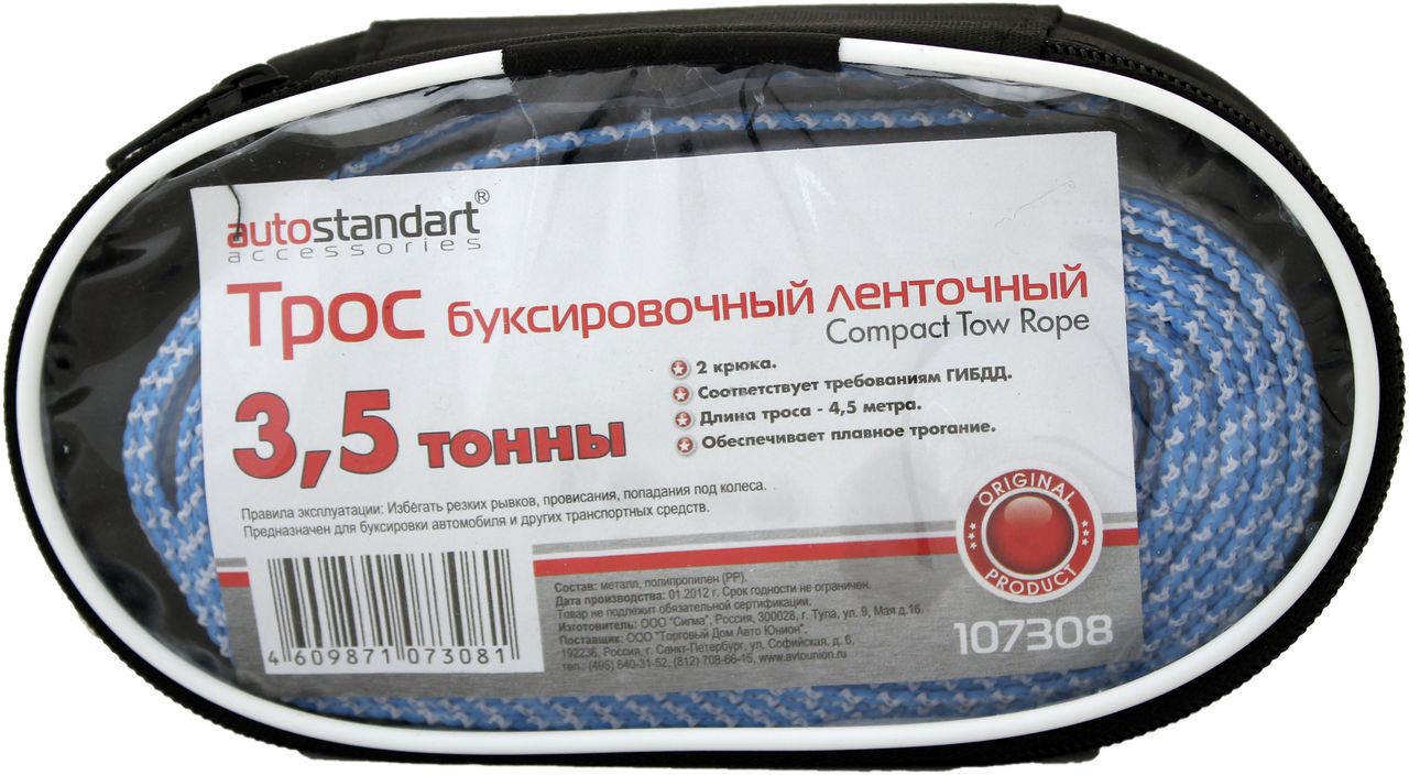 Изготовлен из специальных полипропиленовых волокон. Устойчив к изгибам, не реагирует на перепады температур и обладает очень высокой прочностью. Эластичность троса позволяет буксировать автомобиль без рывков. Это качество сохраняется даже после большого количества циклов растяжения-сжатия. Оснащен металлическими крюками с подпружиненными фиксаторами. Место крепление крюков и троса прошиты двойной строчкой.