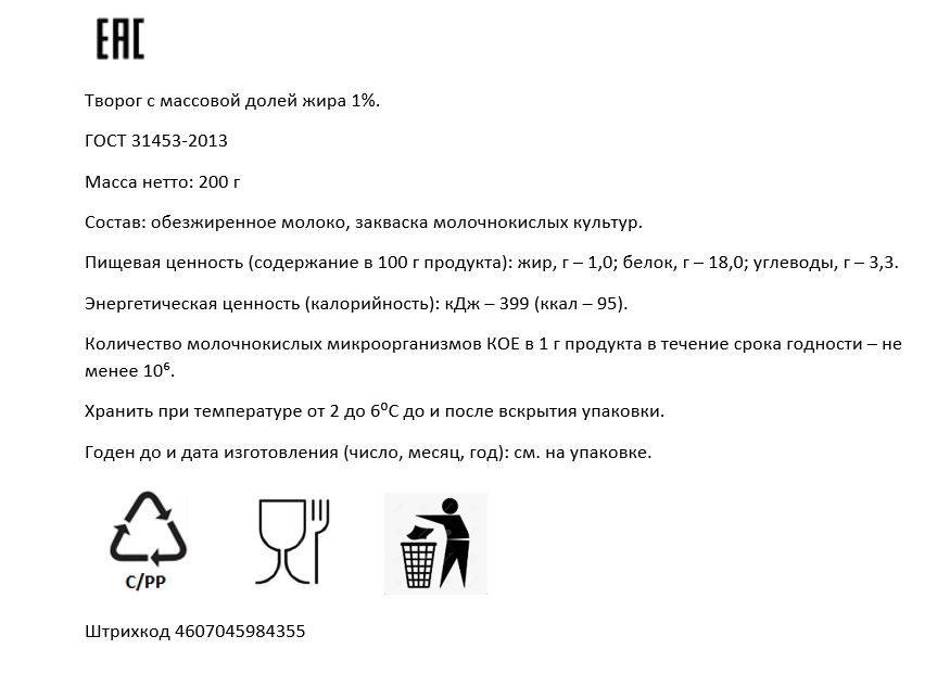 Творог Добрая буренка ГОСТ 1%, 200г