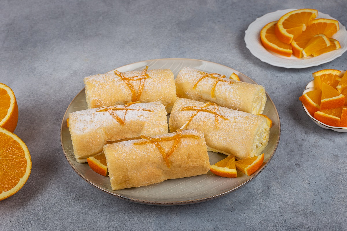 Нежный рулетный бисквит, воздушное суфле с добавлением свежих апельсинов. Рулетики украшены цукатами из апельсиновых корочек, сахарным сиропом и сахарной пудрой.