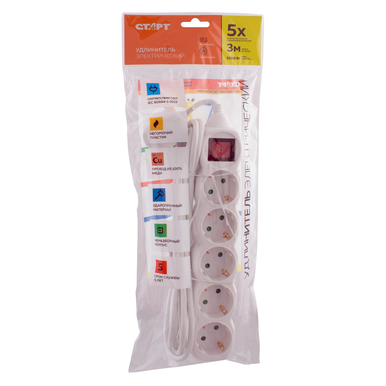 Удлинитель Старт с заземлением и выключателем 5 розеток, 3м
