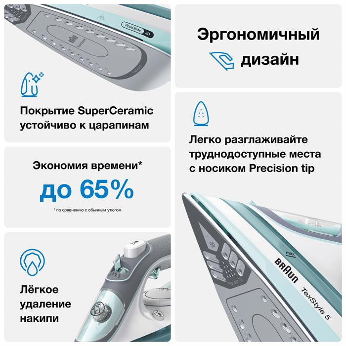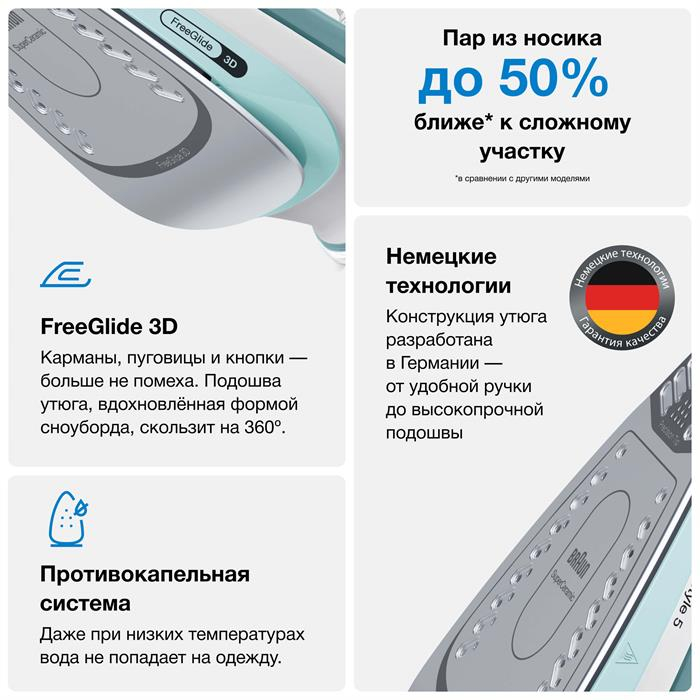 Утюг Braun SI5006BL отличается впечатляющей высокой мощностью, поэтому процесс глажки начинать можно сразу после включения. Вы абсолютно не рискуете повредить даже самую деликатную ткань. Для большей безопасности устройство автоматически выключается, когда вы его не используете. Инновационная конструкция подошвы обеспечивает идеальное скольжение по разным поверхностям. Вы легко обойдете препятствия в виде пуговиц, застежек и прочих элементов. Вещи разглаживаются одинаково эффективно при движениях, направленных в любую сторону. Использование прочных материалов при производстве позволяет не допустить появления мелких царапин, трещин и сколов. При расходе воды обеспечивается максимальная отдача благодаря ее превращению в мелкодисперсный пар. Интенсивность подачи просто отр��гулировать. Вы можете воспользоваться вертикальным отпариванием или паровым ударом.