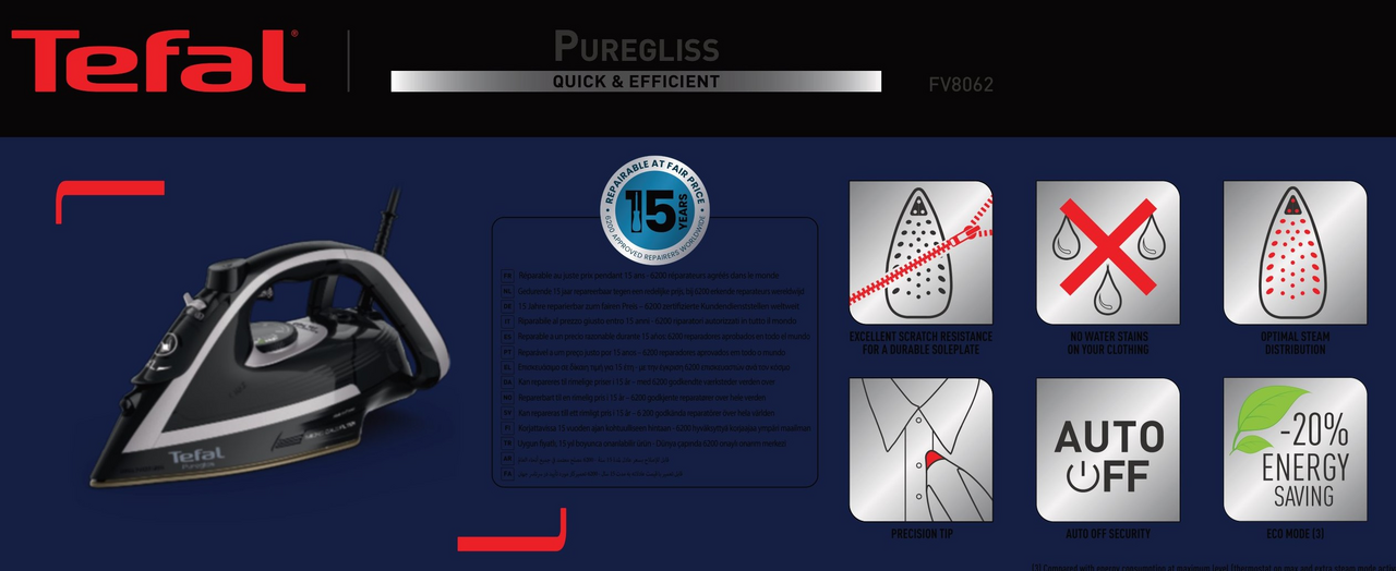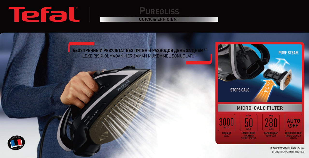 Утюг Tefal Puregliss способен подарить новый опыт повседневного ухода за одеждой и домашним текстилем благодаря своей исключительной силе пара и продвинутым функциям. Высокая мощность 3000Вт позволяет утюгу быть готовым к работе всего через несколько секунд, а постоянная подача пара 50г/мин и паровой удар 280г/мин помогут справиться с самыми упрямыми складками и заломами на любой ткани. Запатентованная система Micro Calc Filter надежно защищает утюг от накипи, продлевая его срок службы и препятствуя образованию пятен на ткани во время глажения.