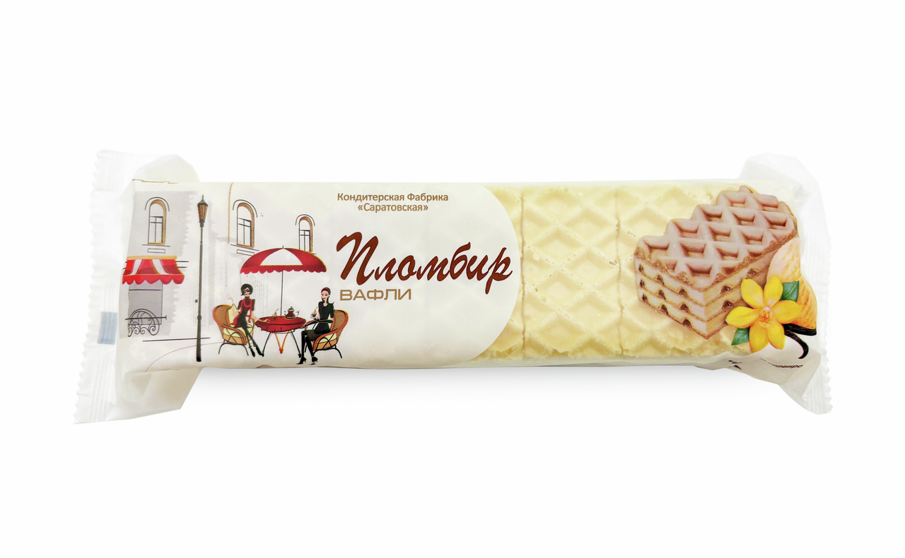 Пышный белоснежный крем со вкусом мороженого Пломбир в сочетании с хрустящим вафельным листом с крупной насечкой. Это нежное и хрустящее лакомство. Две тонкие вафельки с крупной насечкой, а между ними - тонкая прослойка вкусной, умеренно сладкой начинки со ароматом мороженого.