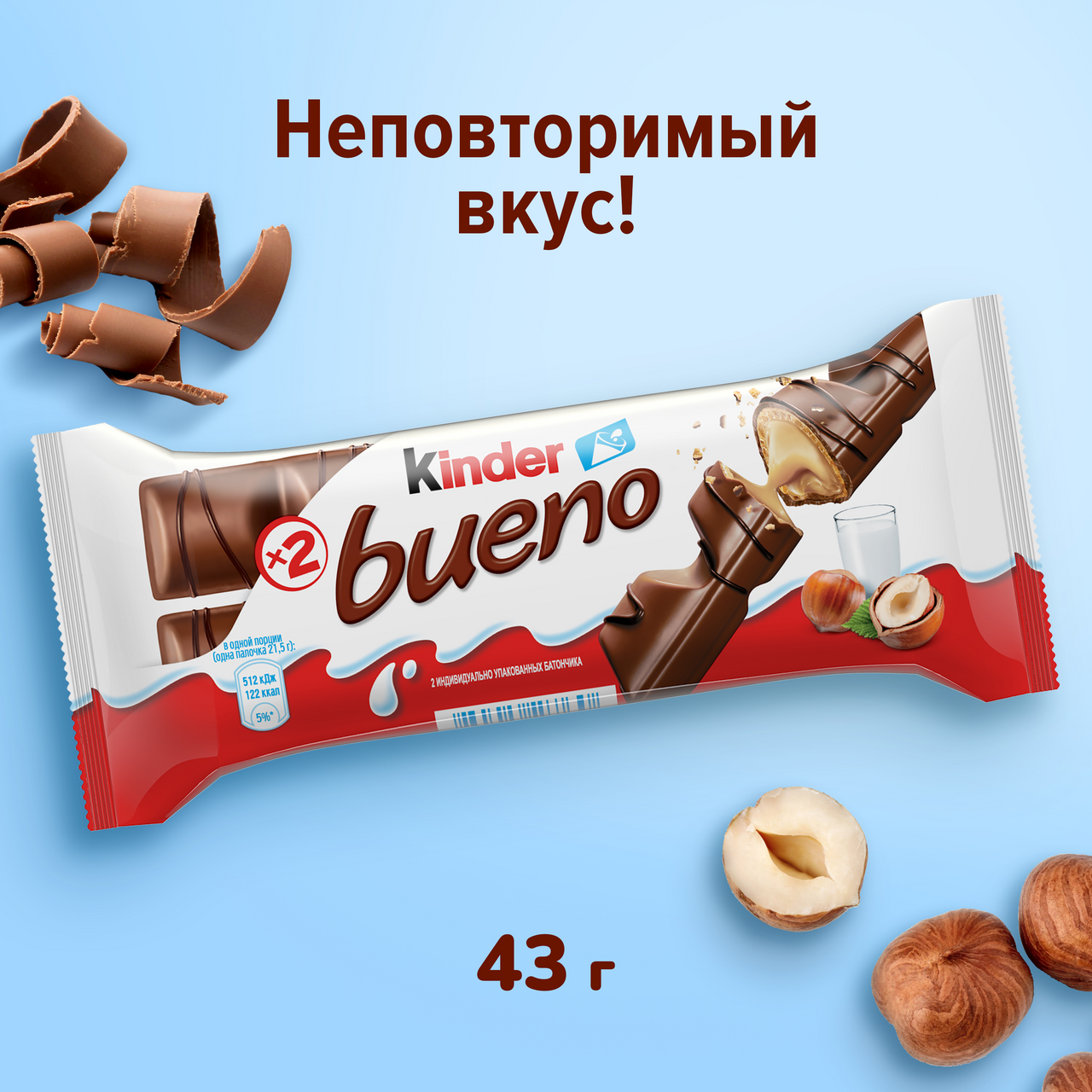 Побалуй себя Kinder Bueno! Хрустящая вафля, покрытая молочным шоколадом с нежной молочно-ореховой начинкой. Два индивидуально упакованных батончика обладают высокими вкусовыми качествами благодаря необычному сочетанию вкусов и текстур. Верх удовольствия!