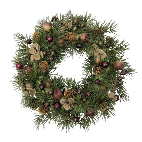 Венок новогодний B&H лесное изобилие - основа фигуры выполнена из пенопласта, по верх которого закреплена зеленая хвоя из лески ПВХ имитирующая сосну с заснеженными кончиками. В роли дополнительно декора используются: шишки, банты и елочные шарики.