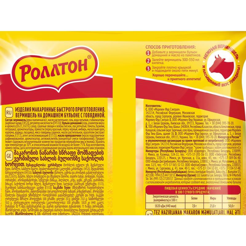 Вермишель мука пшеничная высшего сорта, масло растительное, соль, вода питьевая, стабилизаторы карбонат калия, Е452i, регулятор кислотности Е451i. Бульон домашний соль, усилители вкуса и аромата Е621, Е635, сахар, сушеные овощи и зелень чеснок, лук репчатый, томаты, базилик, петрушка, ароматизаторы, пряности перец красный, перец черный, имбирь, мускатный орех, куркума, корица, гвоздика, мясо говядины сушеное, масло растительное, красители экстракт паприки, Е172, агент антислеживающий Е551. Масло приправочное масло подсолнечное рафинированное, ароматизатор, антиокислитель концентрат смеси токоферолов.