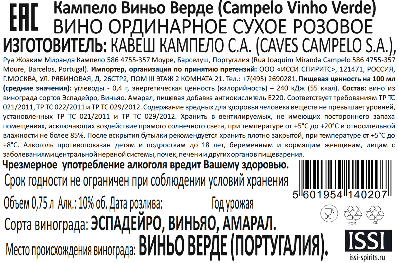 Вино Campelo Vinho Verde розовое сухое, 0.75л изготовлено из купажа четырех сортов: лоурейру, аринту, авессу и тражадура. Сусло проходит ферментацию в стальных чанах, что позволяет напитку сохранить свои натуральные вкусовые и ароматические характеристики. Бледно-желтого цвета с золотистыми переливами вино соблазняет ароматом свежего зеленого яблока, сочной груши и горьковатого грейпфрута. Мягкий, изящный вкус раскрывается оттенками фруктов и цитрусовых, отличается покалывающей кислинкой и обладает приятным гармоничным послевкусием. Выразительный алкогольный напиток составит отличный тандем с моллюсками и устрицами с лимонным соком, мидиями в сливочно-чесночном соусе, легким салатом из креветок и сельдерея, морским коктейлем, рулетом из лаваша с семгой, запеченной куриной грудкой, жареной индейкой, приготовленном на гриле палтусом или тунцом, тарталетками с икрой. Он прекрасно подойдет и в качестве аперитива. Перед подачей алкоголь рекомендуется охладить до 6-8 градусов. Открытое розовое вино следует хранить не больше трех дней.