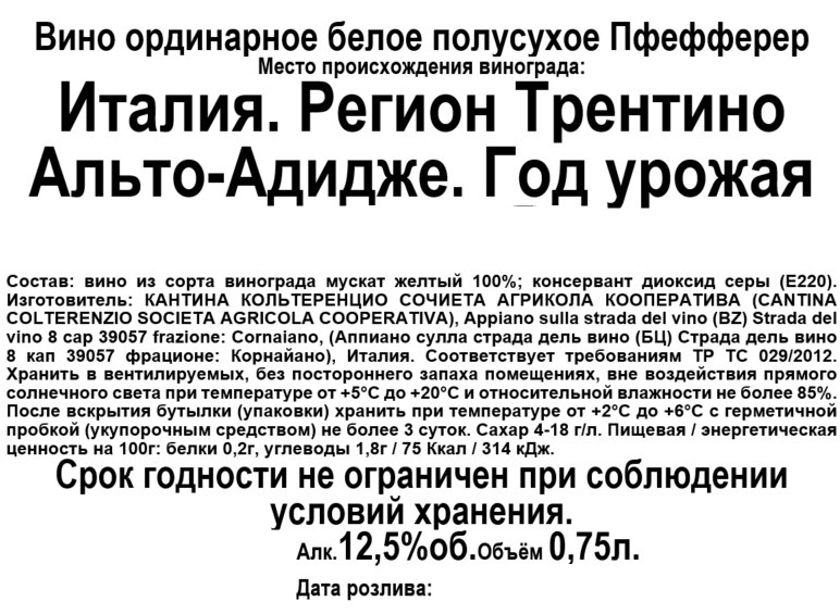 Вино Colterenzio Pfefferer белое полусухое, 0.75л — изысканный алкогольный напиток крепостью 12% родом из знаменитого региона виноделия — Тосканы. Оно подойдет как для праздничного застолья, так и для романтического ужина или повседневного обеда. Разлитое по бокалам, оно смотрится утонченно благодаря своему легкому светло-соломенному цвету. Вкус напитка раскрывается изящными освежающими оттенками фруктов с нюансами минералов, а также умеренной кислотностью в мягком послевкусии. Аромат вина не оставит никого равнодушным — это интригующий букет из запахов спелого персика, сочных цитрусов, сладких пряностей и нежных белых цветов. Вкусо-ароматические характеристики вина лучше всего раскрываются при температуре 10-12C. Подавать Colterenzio Pfefferer рекомендуется перед основным приемом пищи в качестве аперитива. Также напиток изумительно подчеркнет вкус блюд из рыбы и морепродуктов, легких летних салатов, различных закусок, пасты и супов. Выигрышное сочетание — белое полусухое вино и нежнейшая телятина или птица. Представленный легкий напиток изготовлен из спелого винограда сортов шардоне и пино гриджио, произрастающего на юных лозах виноградников Банфи. Сбор урожая производится в конце лета, после чего ягоды проходят стадию деликатной прессовки и подвергаются ферментации в резервуарах из нержавеющей стали на протяжении 13-16 суток при определенном температурном режиме. Затем молодой напиток некоторое время выдерживается в аналогичных емкостях, а в конце января разливается по бутылкам. Компания Colterenzio известна во всем мире за высокое качество выпускаемой продукции. Она неоднократно награждалась на международных конкурсах.