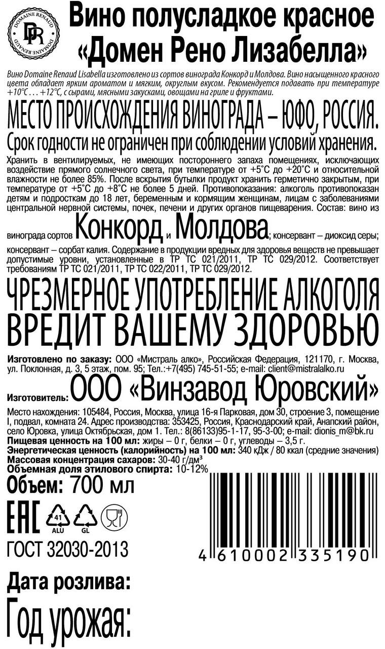 Вино Domaine Renaud Isabella красное полусладкое, 0.7л