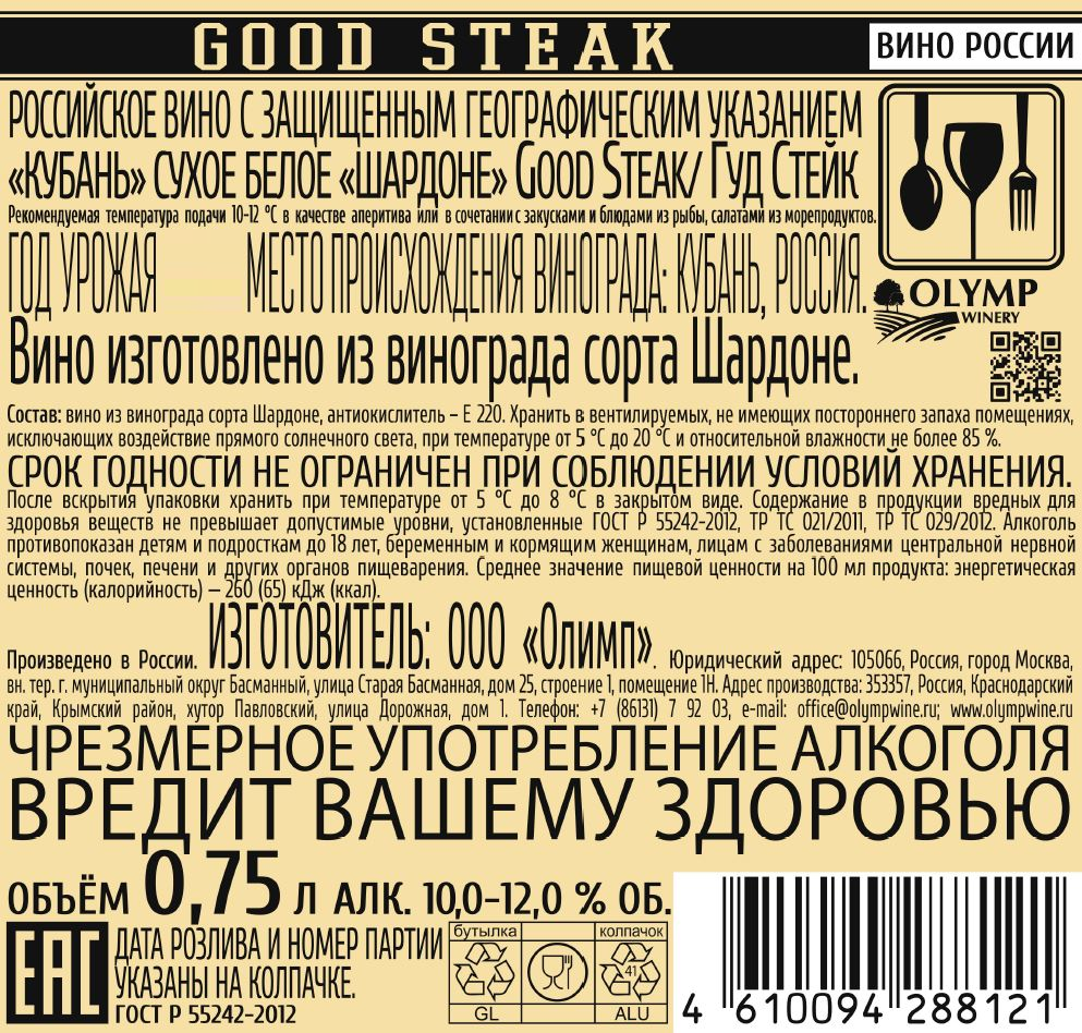 Вино Good Steak Chardonnay белое сухое, 0.75л