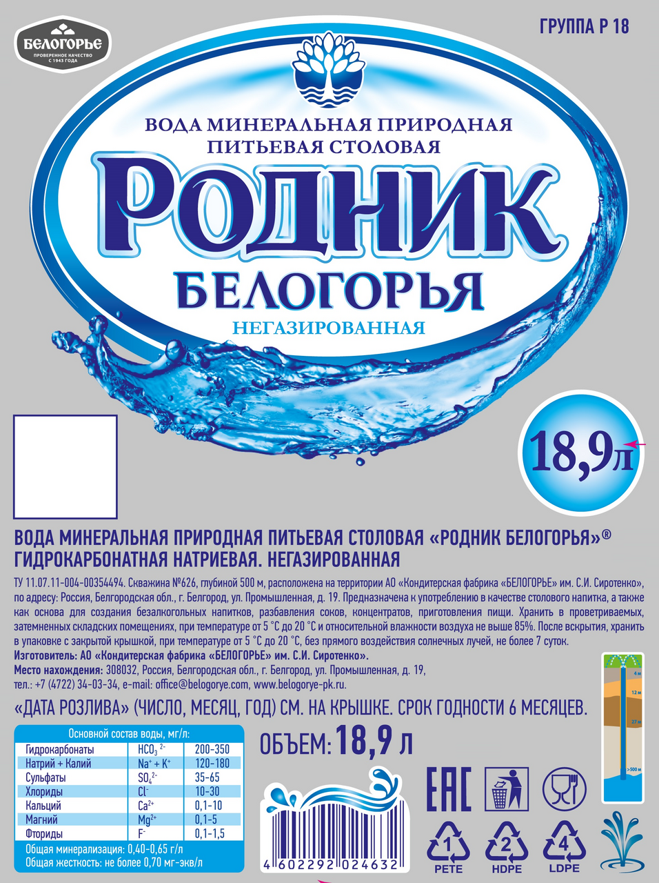 Вода минеральная природная питьевая столовая гидрокарбонатная натриевая Родник Белогорья добывается из скважины № 626 с глубины 500м из бат-келловейского водоносного горизонта Юрского периода.