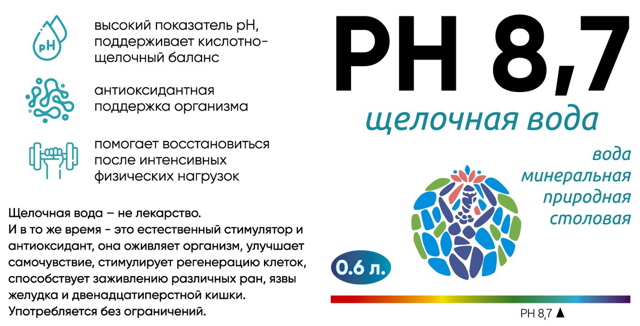 Щелочная вода с природным показателем РН 8,7 или точнее Живая вода очищает организм от шлаков и токсинов на клеточном уровне и значительно усиливает наш иммунитет. Добывается из артезианской скважины, обладает сбалансированным составом минералов. По основному ионному составу вода является гидрокарбонатно-натриевой, характеризуется природной мягкостью. Не оставляет накипи, что продлевает срок службы дорогих кофе-машин, кулеров, чайников. Розлив воды осуществляется на автоматической линии. Подходит для ежедневного использования.