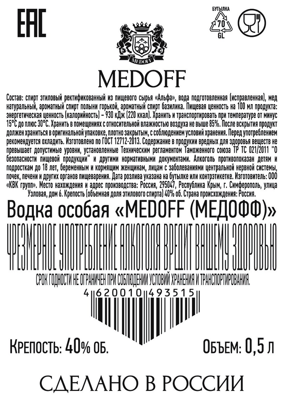 Medoff современный русский шик. Премиальная русская водка обладает восхитительно бархатным и мягким вкусом, благодаря изысканному сочетанию высококачественных спиртов и особо ценного ингредиента, натурального меда. Богатство русской культуры подчеркивает эксклюзивный авторский орнамент, вдохновленный традиционными мотивами хохломы, он погружает в уникальный мир русского национального стиля и неповторимого вкуса.