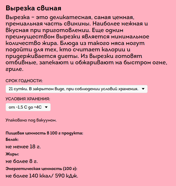 Вырезка – это деликатесная, самая ценная, премиальная часть свинины. Наиболее нежная и вкусная при приготовлении. Еще одним преимуществом вырезки является минимальное количество жира. Блюда из такого мяса могут подойти для тех, кто считает калории и придерживается диеты. Из вырезки готовят отбивные, запекают и обжаривают на быстром огне, гриле.
