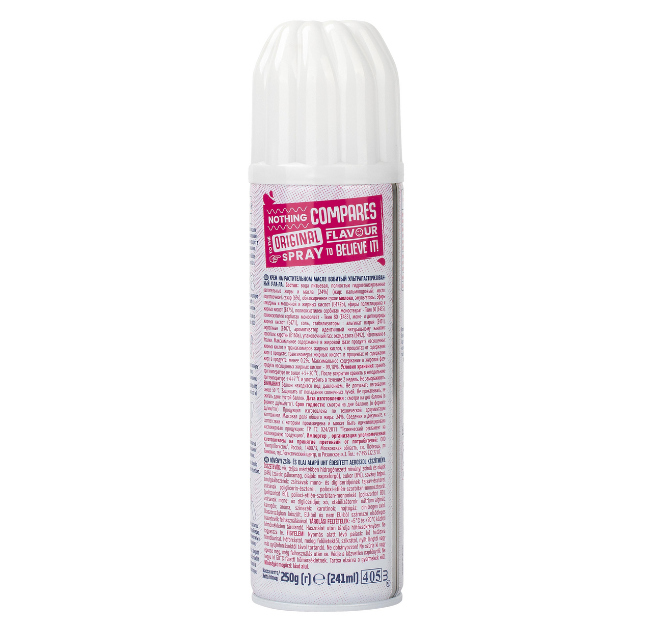 Вода, гидрогенезированное пальмоядровое масло (24%), сахар (8%), молочные белки, эмульгаторы: (E472b), (Е475), (Е433), (Е471), соль, стабилизаторы: (Е401), (Е407), пищевой ароматизатор ванилин, краситель (Е180а), пропелленты (Е942).
