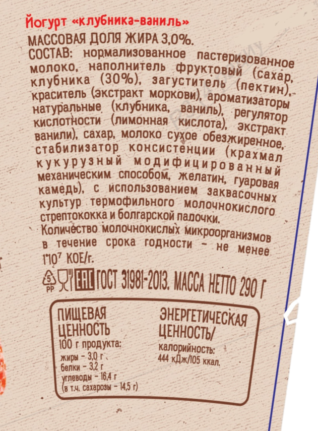 Нормализованное пастеризованное молоко, наполнитель фруктовый сахар, клубника 30%, вода, загустители крахмал кукурузный модифицированный, пектин, краситель экстракт моркови, ароматизаторы натуральные клубника, ваниль содержит молоко, регулятор кислотности лимонная кислота, экстракт ванили, сахар, молоко сухое обезжиренное, стабилизатор консистенции желатин свиной, крахмал картофельный модифицированный, пектин, с использованием заквасочных культур термофильного молочнокислого стрептококка и болгарской палочки.