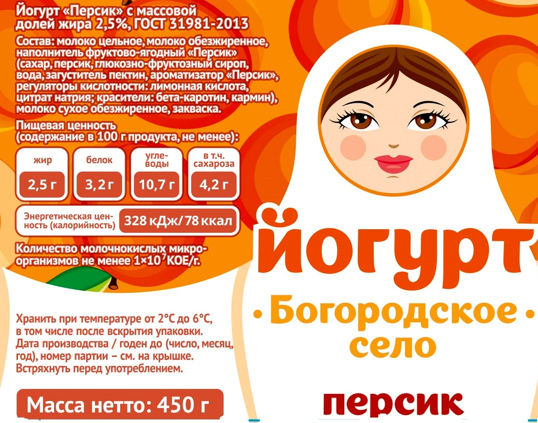 Молоко цельное, молоко обезжиренное, наполнитель фруктово-ягодный Персик (сахар, персик, глюкозно-фруктовый сироп, вода, загуститель пектин, ароматизатор Персик, регулятор кислотности: лимонная кислота, цитрат натрия, красители: бета-каротин, кармин), молоко сухое обезжиренное, закваска.