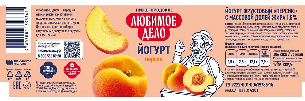 Молоко обезжиренное, молоко цельное, наполнитель фруктовый Персик сахар, персиковое пюре, яблочное пюре, загуститель пектины, регулятор кислотности лимонная кислота, ароматизатор, красители: экстракт паприки, сахарный колер 1 простой, I бета – каротин, консервант сорбат калия, закваска.
