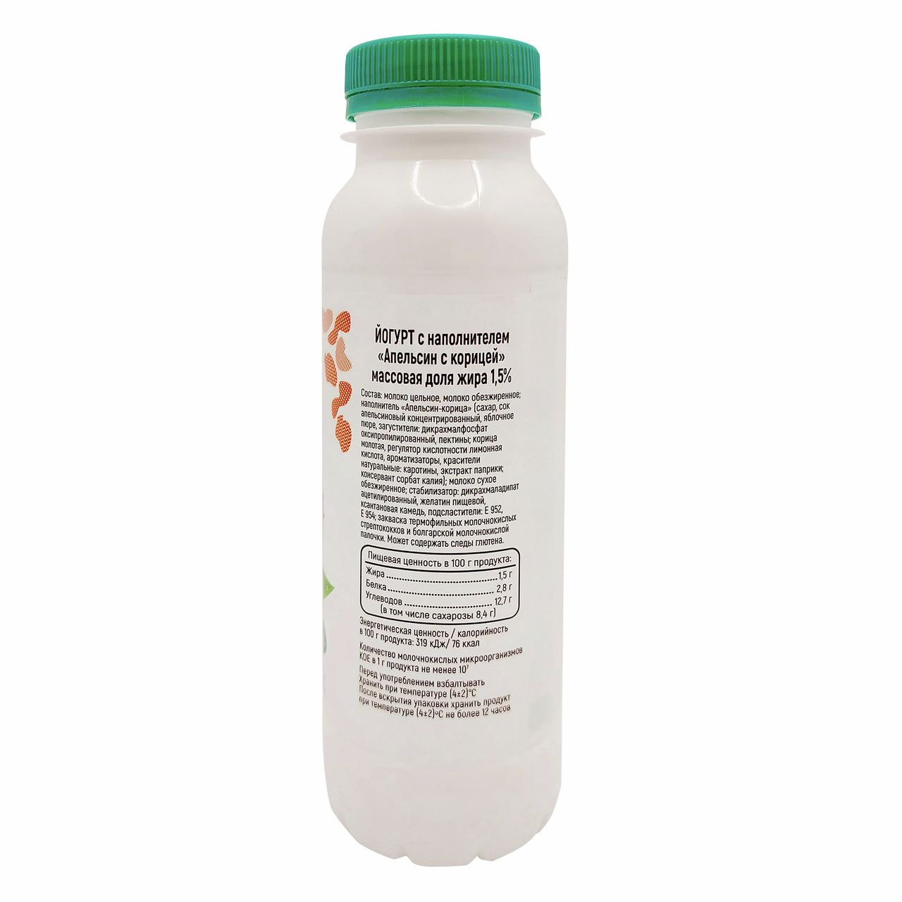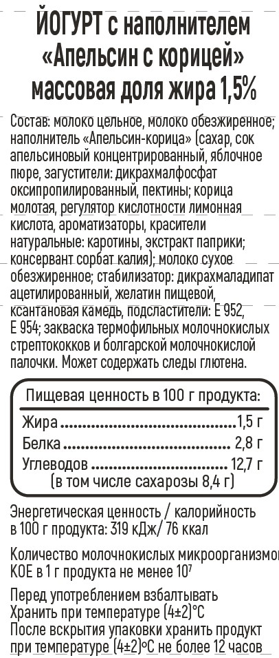 Молоко цельное, молоко обезжиренное, наполнитель Апельсин - корица [сахар, сок апельсиновый концентрированный, яблочное пюре, загустители: дикрахмалфосфат оксипропилированный, пектины, корица молотая, регулятор кислотности лимонная кислота, ароматизаторы, красители натуральные: каротины, экстракт паприки, консервант сорбат калия), молоко сухое обезжиренное, стабилизатор: дикрахмаладипат ацетилированный, желатин пищевой, ксантановая камедь, подсластители: E 922, E954, закваска термофильных молочнокислых стрептококков и болгарской молочнокислой палочки.