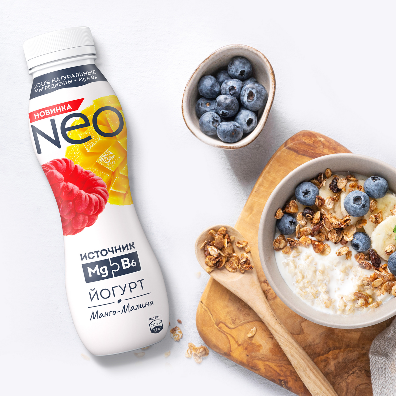Питьевой йогурт Neo манго-малина - полезный йогурт с нежной текстурой, производится из 100% натуральных ингредиентов с добавлением магния и витамина В6. Йогурт питьевой со сниженным содержанием сахара также включает магний и витамин B6, которые помогают снизить нервное напряжение, способствуют правильному обмену веществ, борются с усталостью и важны для поддержания энергетического баланса.