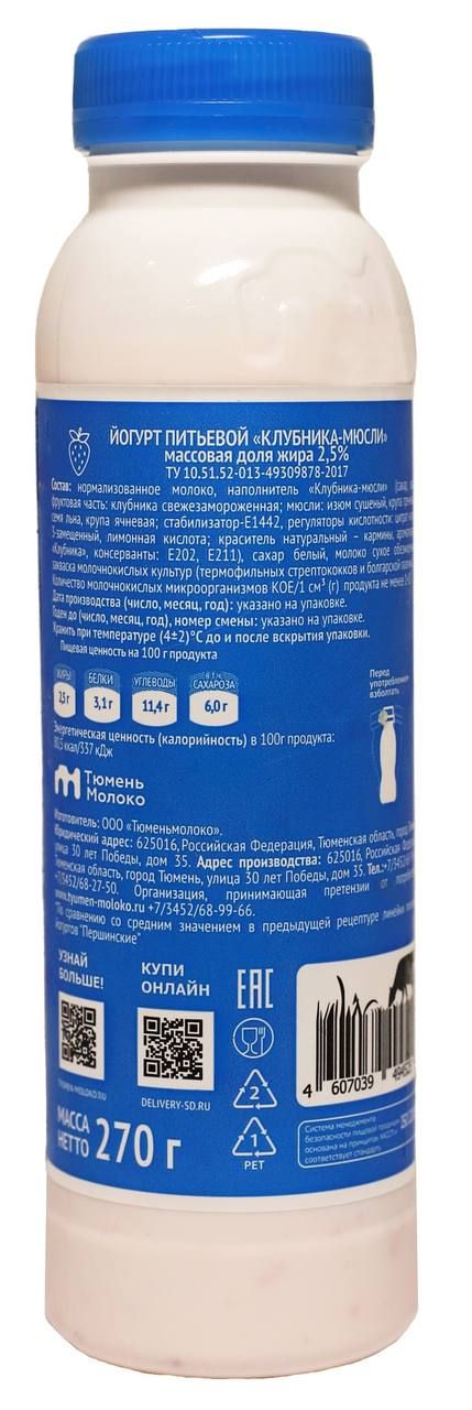 Молоко нормализованное, наполнитель Клубника-мюсли (сахар, вода, фруктовая часть: клубника свежезамороженная; мюсли: изюм сушеный, крупа гречневая, семя льна, крупа ячневая; стабилизатор-Е1442, регуляторы кислотности: цитрат натрия 3-замещенный, лимонная кислота; краситель натуральный - кармин, ароматизатор Клубника, консерванты: Е202, Е211), сахар-песок, молоко сухое обезжиренное, закваска молочнокислых бактерий.