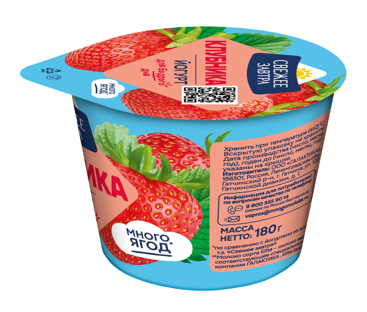 Много ягод и много фруктов - линейка густых йогуртов с натуральными ягодами и фруктами в составе. Йогурты созданы из молока сорта Elite, с высоким содержанием целых ягод и больших кусочков фруктов. В линейке много ягод и много фруктов использованы простые и только натуральные ингредиенты, в составе нет Е компонентов. Вкуснейший безглютеновый продукт, произведенный по концепции чистая этикетка без использования Е-добавок. В его состав входят только простые и понятные ингредиенты: высококачественное молоко с российских молочных хозяйств, сахар, клубничный наполнитель и закваска. Продукт служит источником полезных живых бактерий, которые благотворно влияют на микрофлору кишечника и повышают иммунитет. Благодаря натуральной рецептуре и низкой калорийности он отлично подойдет для приверженцев здорового питания.