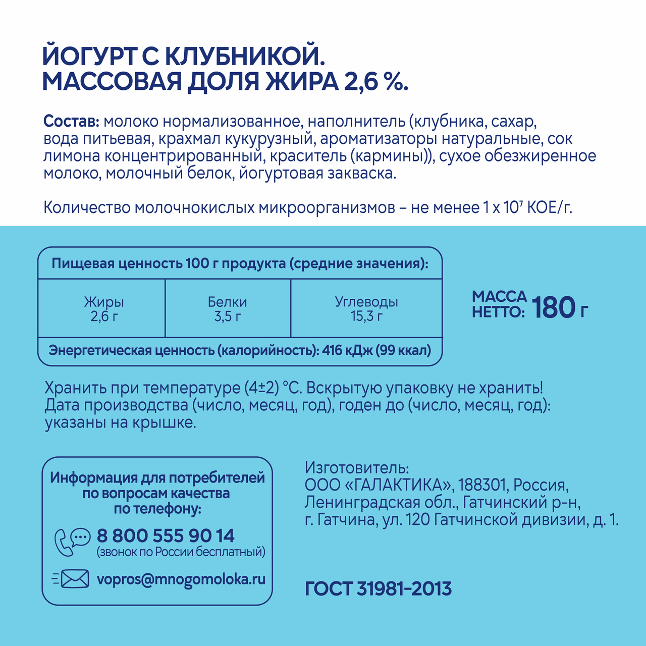 Молоко нормализованное, наполнитель клубника, сахар, вода питьевая, крахмал кукурузный, ароматизаторы натуральные, сок лимона концентрированный, краситель кармины, сухое обезжиренное молоко, молочный белок, йогуртовая закваска.