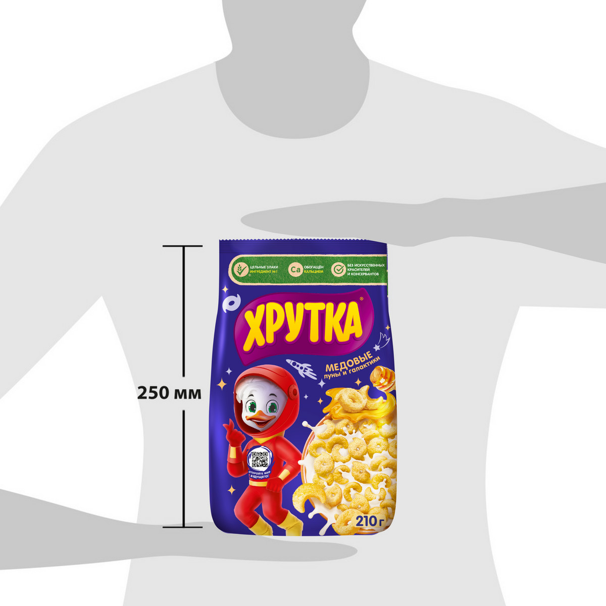 Готовый завтрак Хрутка медовые луны и галактики – это заряд позитива на все утро, как для юных космонавтов, так и для их родителей! Кукурузный готовый завтрак с натуральным мёдом не только вкусный, но и полезный! Цельные злаки являются источником клетчатки и сложных углеводов, которые обеспечивают наш организм энергией. А еще продукт обогащен кальцием, который так важен для поддержания здоровья костей и зубов. Мамы оценят такой завтрак - он не требует много времени на приготовление, а детям понравятся вкус и оригинальная форма в виде лун и галактик! Путешествуйте с Хрутка по вселенной и наслаждайтесь космической вкуснятиной на завтрак!