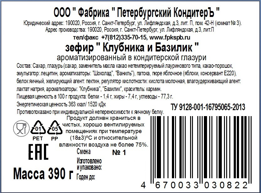 Зефир Петербургский кондитеръ клубника-базилик в глазури, 390г
