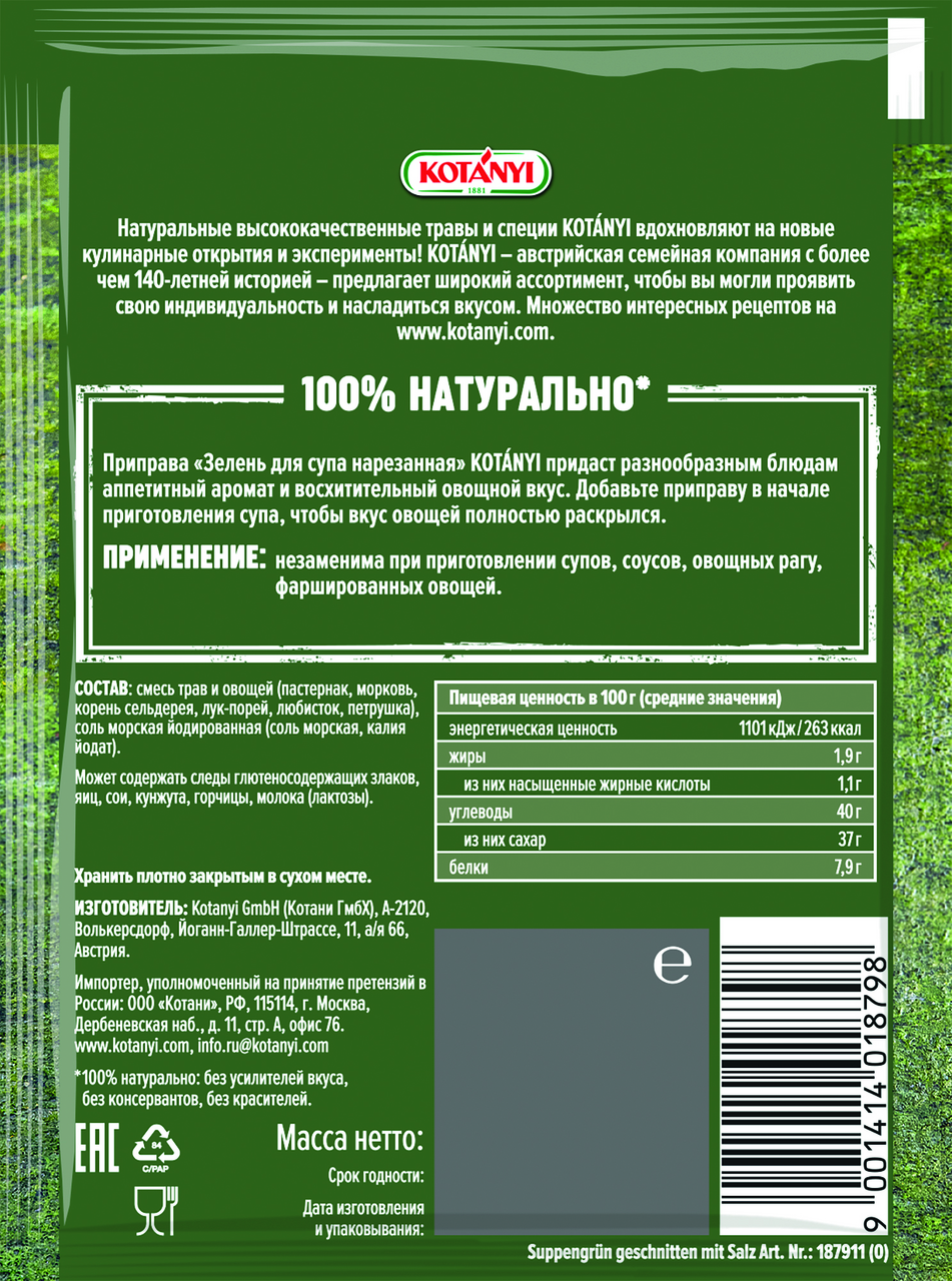 Зелень для супа нарезанная Kotanyi, 24 г — представлена гармонично сочетающимися сушеными травами и специями с добавлением овощей и йодированной соли. Данный продукт отличается натуральным составом: в нем нет усилителей вкуса и запаха, консервантов, ГМО и красителей. Такая смесь придаст первым блюдам насыщенный аромат и потрясающий вкус. Она подходит для приготовления любых супов и бульонов: мясного, овощного, грибного, лукового, картофельного, сырного, фасолевого, горохового и даже рыбного. Каждый из компонентов приправы для супа насыщен полезными для здоровья человека ингредиентами: белками, жирами, углеводами, витаминами (К, Е, С, PP, группы В), макроэлементами (магний, натрий, кальций, калий, фосфор) и микроэлементами (цинк, медь, железо, селен, марганец). Такая смесь повышает аппетит и нормализует пищеварение, не допускает развития авитаминоза, укрепляет иммунитет. Для того, чтобы суп получился наиболее ароматным и вкусным, рекомендуется добавлять зелень за 10-15 минут до готовности. Если вы делаете первое блюдо в мультиварке, то засыпайте пряности сразу в остальными компонентами. Эта приправа — универсальна, она подойдет не только для первых блюд, но и для соусов, маринадов, подлив, а также пельменей.