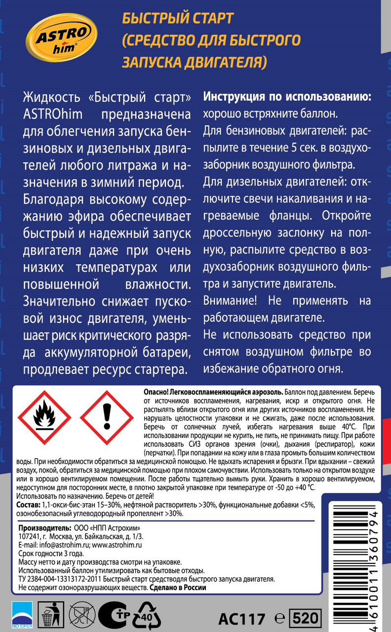 Жидкость для быстрого старта Astrohim предназначена для облегчения легкого запуска бензиновых и дизельных двигателей любого литража и назначения в зимний период. Благодаря высокому содержанию эфира обеспечивает быстрый и надежный запуск двигателя даже при очень низких температурах или повышенной влажности. Значительно снижает пусковой износ двигателя, уменьшает риск критического разряда аккумуляторной батареи, продлевает ресурс стартера.