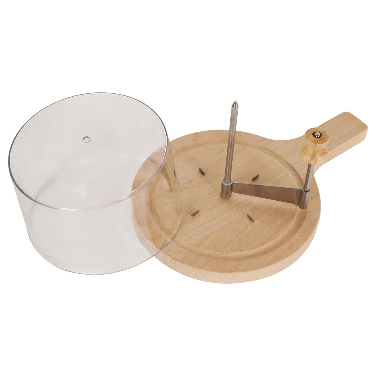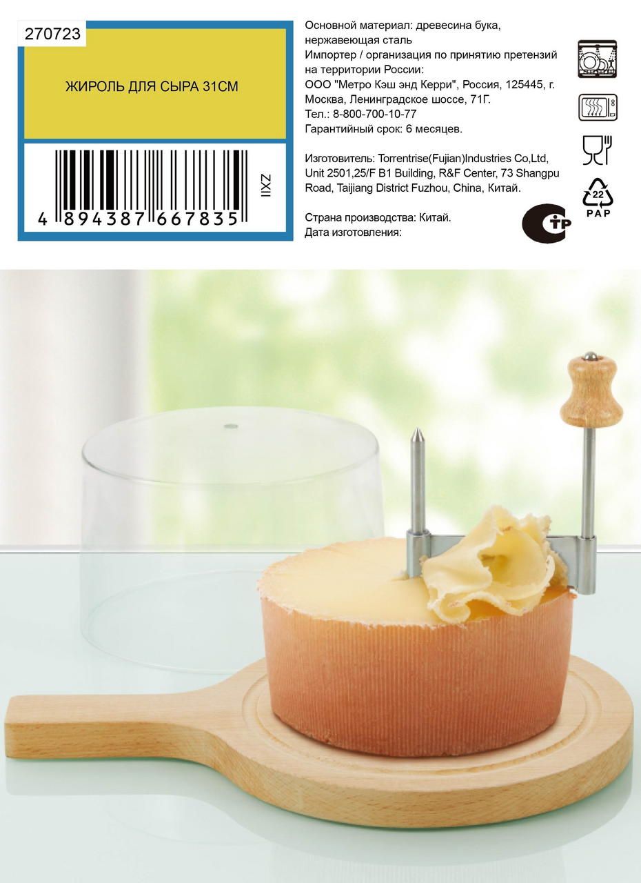 Жироль - это уникальный инструмент, специально предназначенный для нарезки деликатесных сортов сыра, таких как Эдам, Petit Basque, или твердые копченые сыры. Кроме того, жироль можно использовать для создания шоколадных завитков, идеально подходящих для украшения домашней выпечки. При вращении жироль создает тонкую стружку, которая напоминает кружевные розочки, добавляя эстетическую изюминку вашим блюдам. Способ использования: Отрежьте верхнюю часть (корку) у целой головки сыра. Наденьте сыр на стержень, а сверху закрепите нож с ручкой. Во время вращения не нужно сильно надавливать на сыр - усилий для нарезки тонких ломтиков потребуется совсем немного. Комплектация: доска деревянная с ручкой 21х31х2 см, колпак акриловый 17х11 см, нож с ручкой.